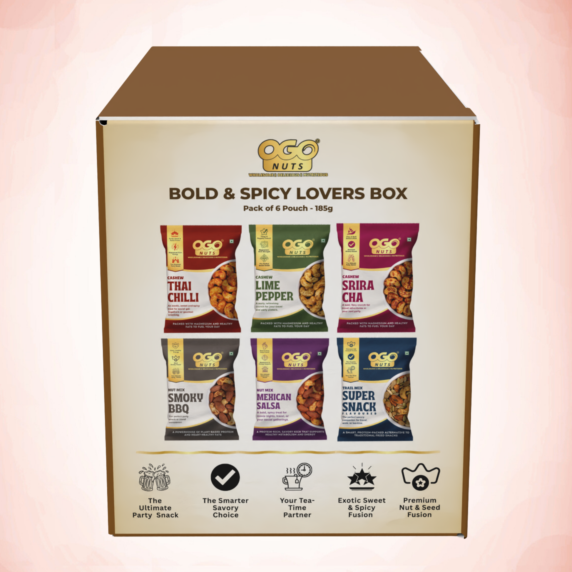 Ignite your senses with the Bold & Spicy Lovers Box, a curated ensemble of our most vibrant and zesty creations. This premium collection is designed for those who crave a sophisticated kick, featuring everything from the fiery heat of Sriracha Cashews and the exotic zest of Thai Chilli Sweet Cashews to the tangy punch of Lime & Pepper. We’ve also included our fan-favorite Mexican Salsa and Smoky BBQ Nut Mixes, alongside our iconic Flavoured Super Snack Trail Mix. Every nut is roasted using our signature 0% oil process, ensuring that the bold, "chatpata" flavors take center stage without any greasy residue.